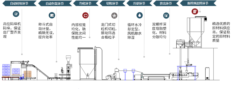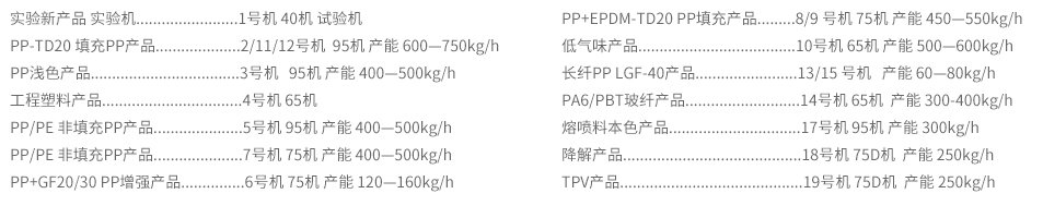 現公司擁有 29條 雙螺桿擠出生產線,其中KRAUSS-MAFFEI配備BRABENDER矢重秤,可以保證精確的控制,車間標配自動包裝機、碼垛機、自動配色稱重系統(tǒng)。生產高性能的改性工程塑料。